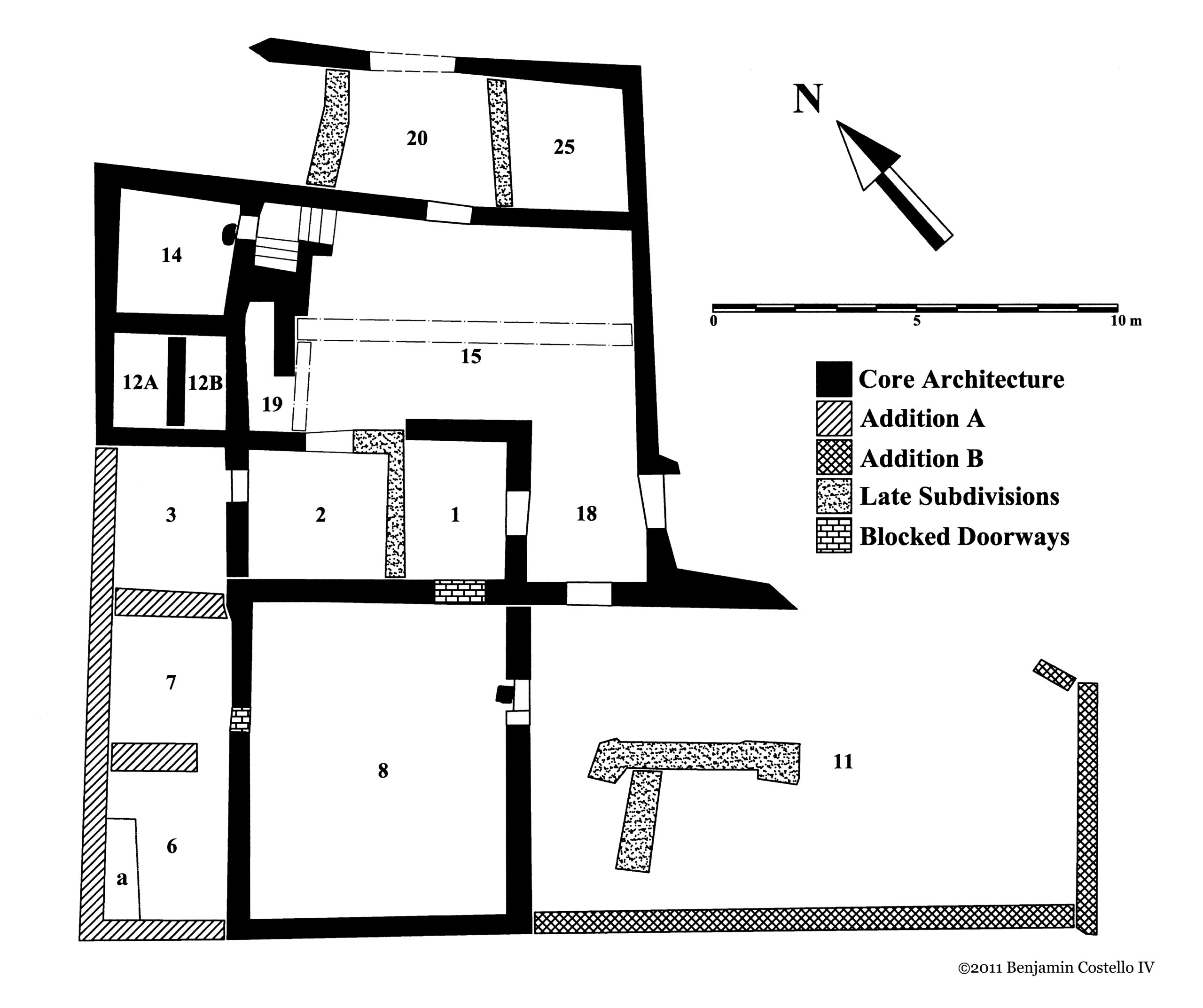Πιθανόν η αρχική είσοδος στην οικία να γινόταν από ένα μικρό δρόμο στα βόρεια, ο οποίος οδηγούσε σε μια πλακόστρωτη αυλή. Λίγο πριν τον μεγάλο σεισμό, έγιναν σημαντικές μετατροπές και προσθήκες εντός του κτηρίου.