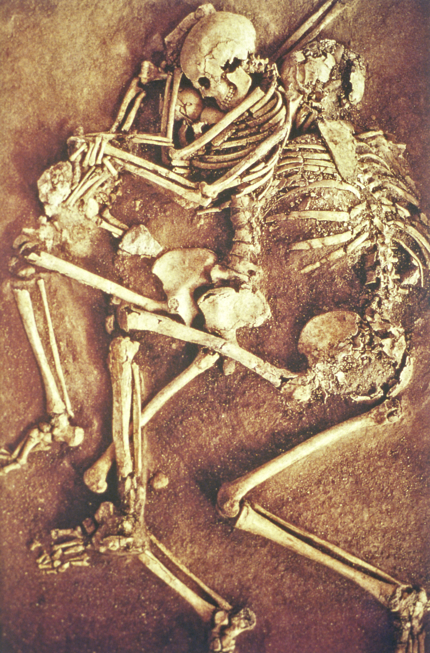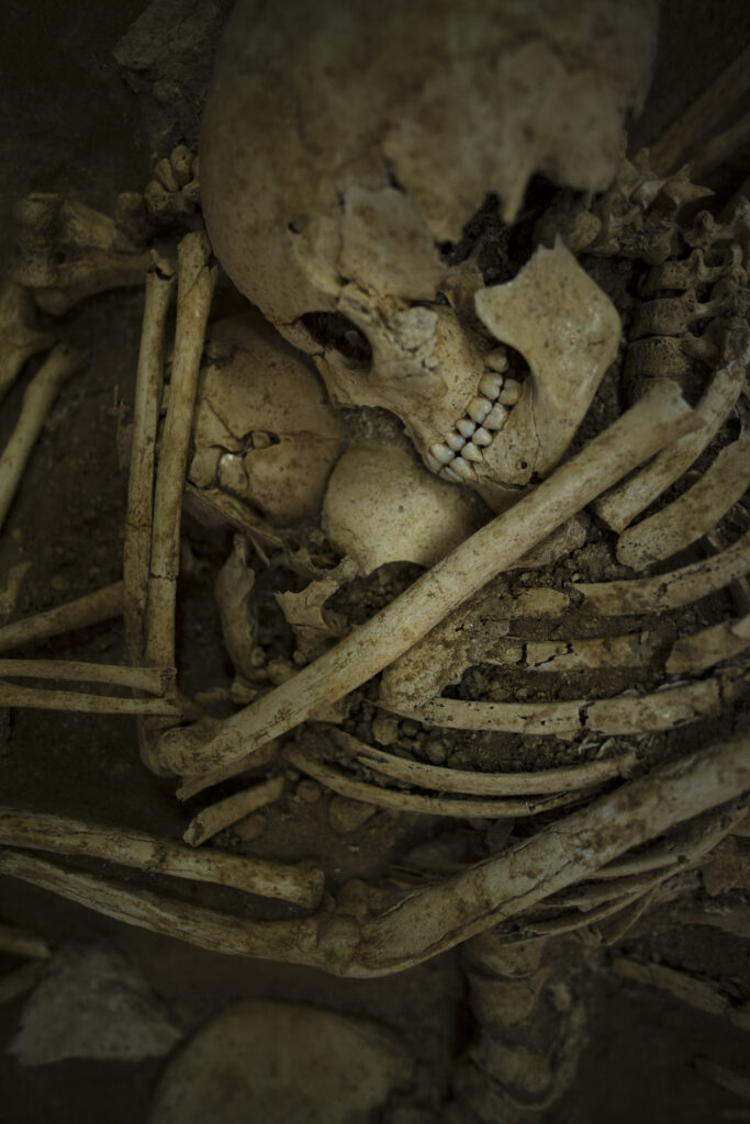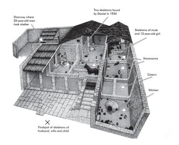 Εντός της οικίας εντοπίστηκαν επτά ανθρώπινοι σκελετοί, ανάμεσα στους οποίους μιας γυναίκας που κρατούσε στην αγκαλιά της ένα παιδί 1,5 χρονών και ενός άνδρα που αγκάλιαζε και τους δύο. Η νεαρή γυναίκα φορούσε στα μαλλιά της μία περόνη (είδος καρφίτσας), ενώ ο άνδρας ένα δακτυλίδι με το χριστόγραμμα, γεγονός που μαρτυρεί ότι η οικογένεια είχε ήδη ασπαστεί το χριστιανισμό. Επιπλέον, στον στάβλο της οικίας εντοπίστηκε ο σκελετός ενός γαϊδουριού δεμένου με σιδερένια αλυσίδα σε πέτρινη ταΐστρα, ενώ δίπλα στο γαϊδούρι βρέθηκε ο σκελετός ενός κοριτσιού. Το γεγονός ότι τα θύματα εντοπίστηκαν άταφα και βρέθηκαν ανέπαφα κατά τις ανασκαφές, υποδηλώνει ότι είχαν παγιδευτεί κάτω από τα συντρίμμια του κτηρίου, το οποίο διέσωσε έτσι την εικόνα της ζωής μίας απλής οικογένειας στο Κούριο του 4ου αιώνα μ.Χ.