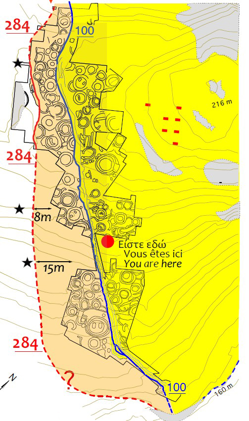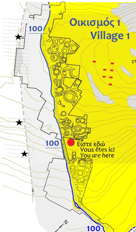 Οι ανασκαφές που διεξήχθησαν από το 1977 έδειξαν ότι τα εσωτερικά όρια του οικισμού τροποποιήθηκαν κατά τη διάρκεια της ζωής του: το χωριό επεκτάθηκε δυτικά προς την κορυφή του λόφου καθώς και στη νότια πλαγιά του και κτίστηκε ένας νέος περίβολος.