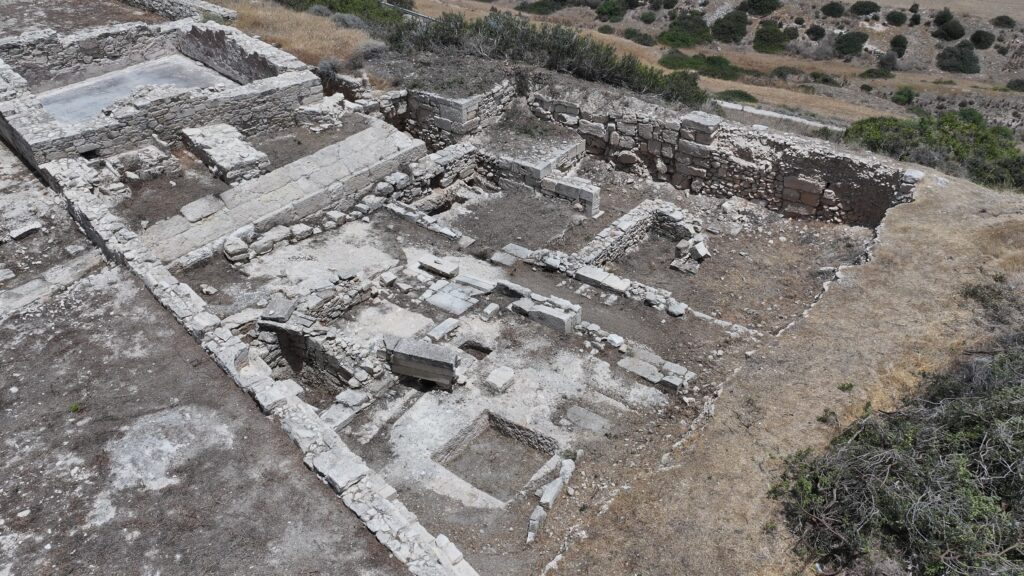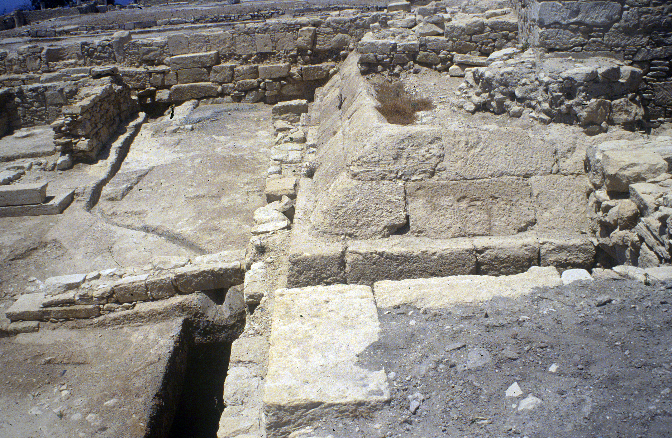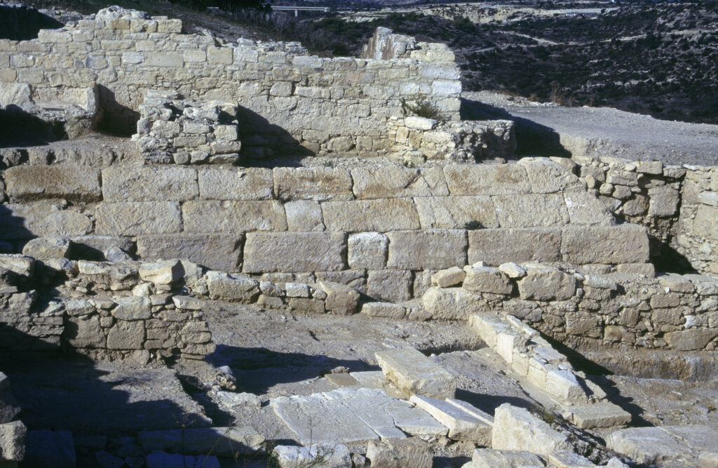 Τα αρχαιότερα ανασκαφέντα αρχιτεκτονικά κατάλοιπα στο χώρο του Κουρίου εντοπίζονται κοντά στο βορειοανατολικό άκρο του λόφου, πλησίον του συγκροτήματος των Δημοσίων Λουτρών και της Αγοράς. Καλύπτουν μια περιοχή 250 τετραγωνικών μέτρων και χρονολογούνται στην Ύστερη Κυπρο-κλασσική περίοδο (4ος αιώνας π.Χ.). Πρόκειται για ένα μεγάλο πυραμιδόσχημο οικοδόμημα κατασκευασμένο με μεγάλες πελεκημένες πέτρες, σύμφωνα με το ακανόνιστο ισοδομικό σύστημα τειχοδομίας.