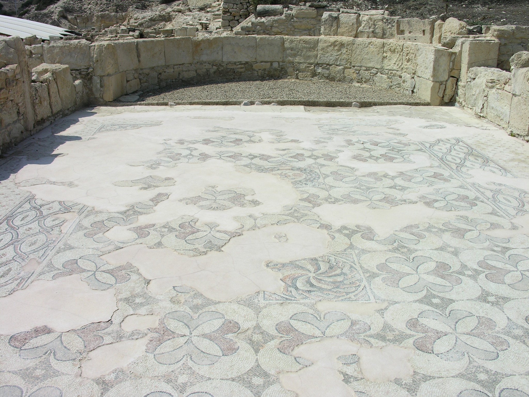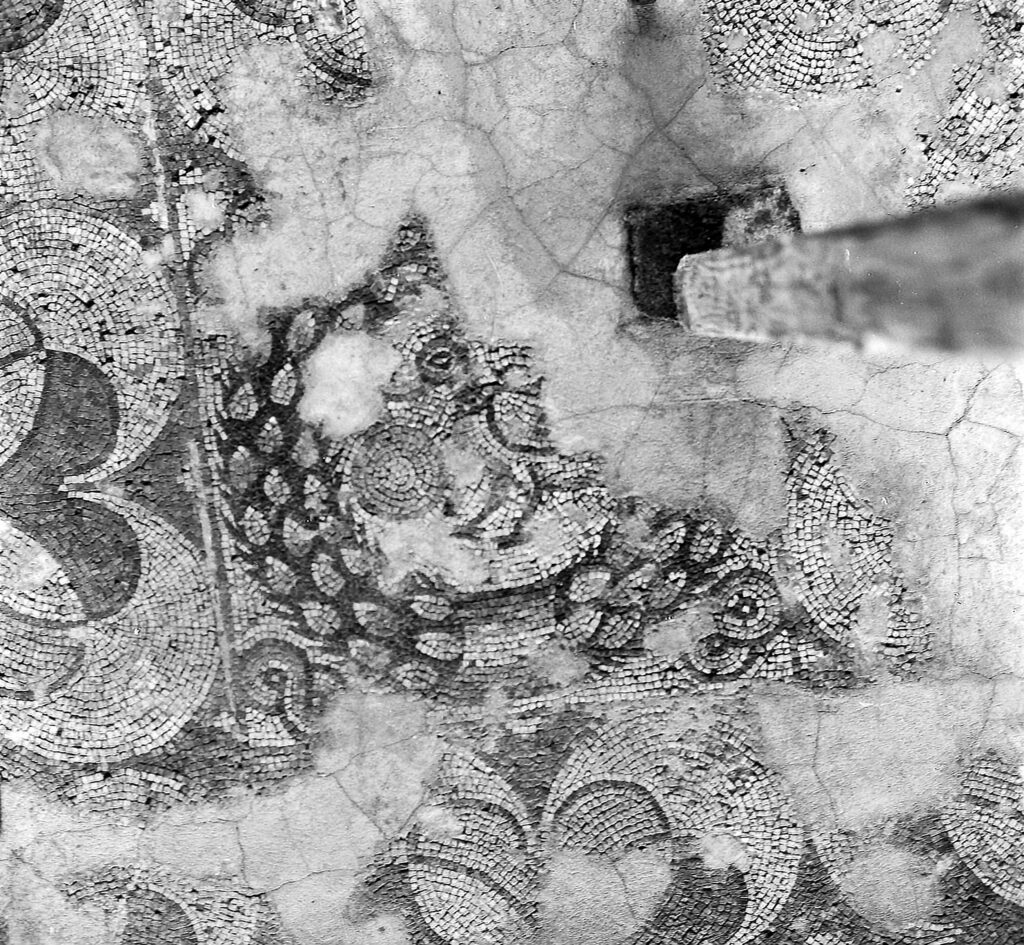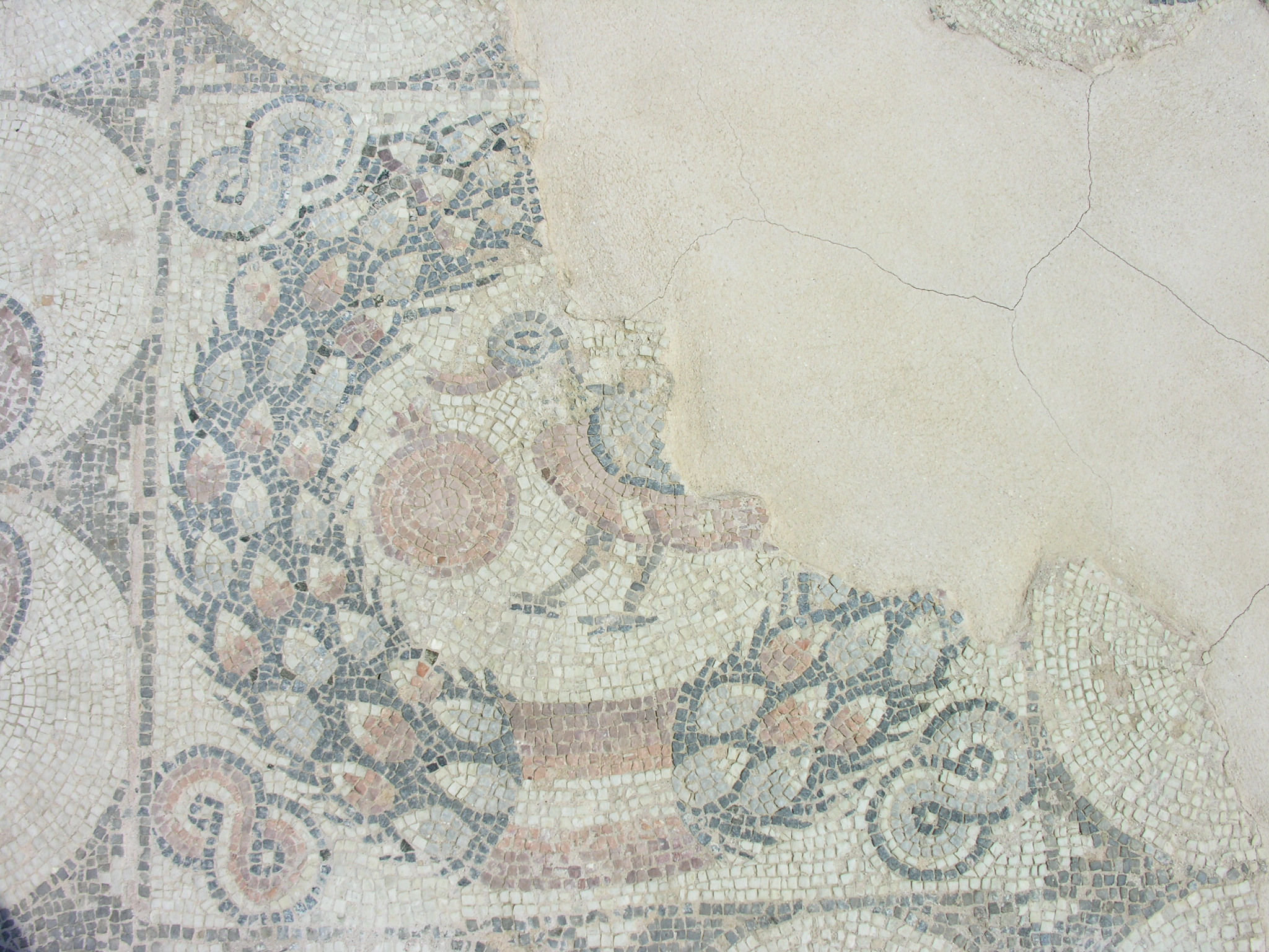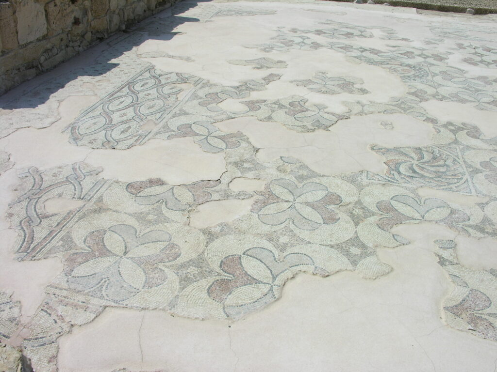 Το δάπεδο του προθαλάμου που οδηγεί στην αψιδωτή αίθουσα ήταν αρχικά διακοσμημένο με μαρμαροθέτημα opus sectile (δάπεδο από πολύχρωμα μαρμάρινα πλακίδια). Η αψιδωτή αίθουσα διέσωσε πολύχρωμο ψηφιδωτό δάπεδο, διακοσμημένο με γεωμετρικά μοτίβα, τα οποία περιβάλλουν δύο τετράγωνα. Στο πρώτο παρουσιάζεται μοτίβο πυροστρόβιλου περικυκλωμένου από πλοχμό, ενώ στο δεύτερο απεικονίζεται πάπια, που ετοιμάζεται να τσιμπήσει με το ράμφος της ένα ρόδι. Η δεύτερη παράσταση περιβάλλεται από δάφνινο στεφάνι. Τα μικρότερα δωμάτια εκατέρωθεν της αψιδωτής αίθουσας έχουν ψηφιδωτά δάπεδα με απλά γεωμετρικά μοτίβα από λευκές και μαύρες ψηφίδες. Σύμφωνα με την τεχνοτροπία των ψηφιδωτών, τα δάπεδα χρονολογούνται στον 5ο ή 6ο αιώνα μ.Χ.