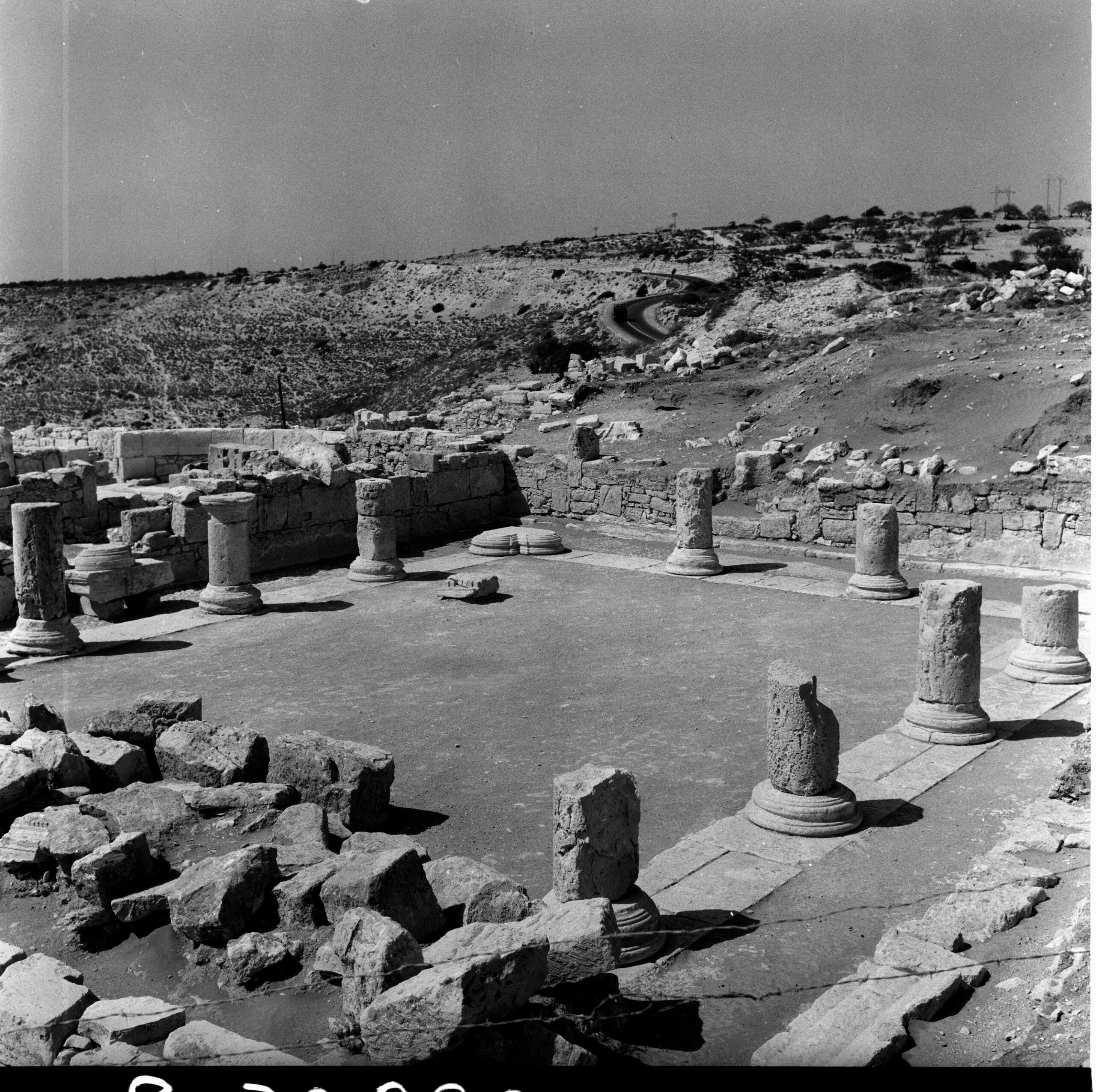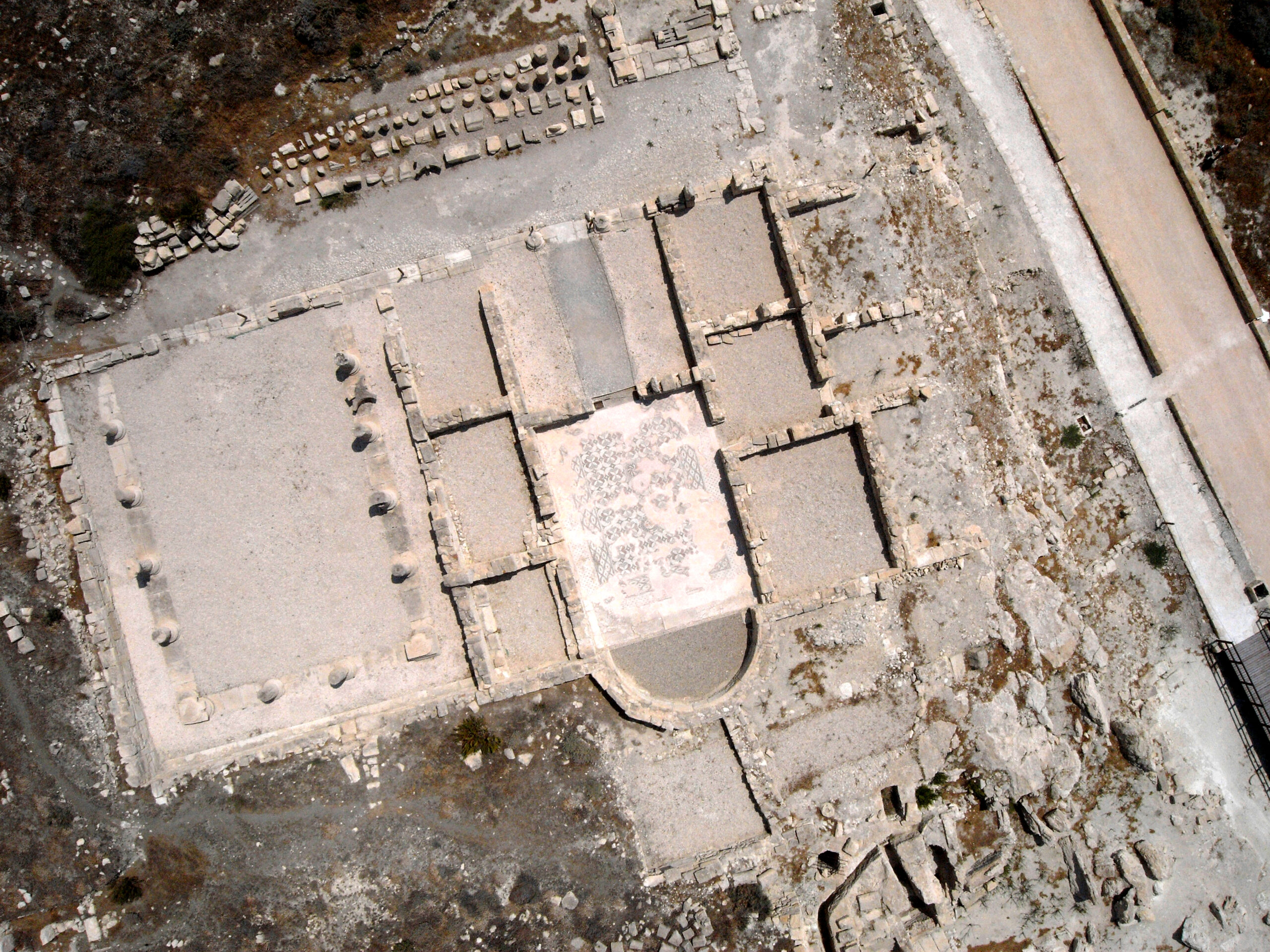 Η μεγάλη αψιδωτή αίθουσα προηγείται ενός προθαλάμου και πλαισιώνεται από μια σειρά τριών δωματίων εκατέρωθεν. Υπάρχουν μαρτυρίες για περισσότερα δωμάτια στη νότια πλευρά, τα οποία, ωστόσο, κατέρρευσαν. Στη βόρεια πλευρά, τα δωμάτια συνορεύουν με ένα μεγάλο ορθογώνιο υπαίθριο χώρο, o οποίος περιβάλλεται από στοές με κιονοστοιχίες στις τρεις πλευρές του.