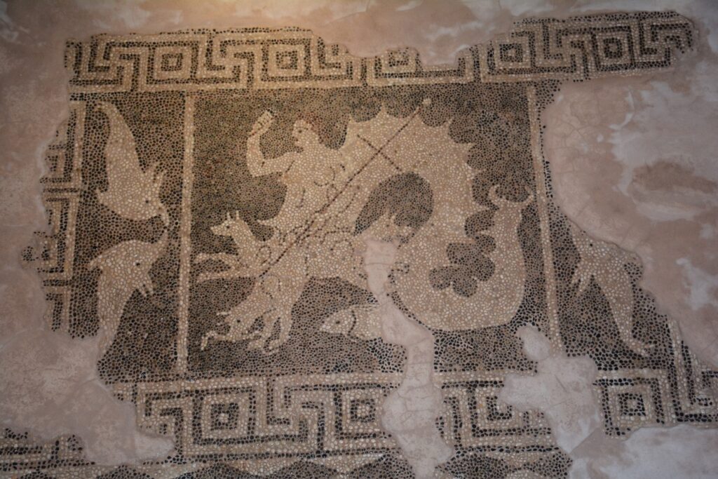 Το δάπεδο που καλύπτει το πρώτο δωμάτιο, στα αριστερά της σημερινής εισόδου της οικίας, είναι το αρχαιότερο μέχρι σήμερα γνωστό ψηφιδωτό στην Κύπρο. Χρονολογείται στην Ελληνιστική περίοδο, δηλ. στο τέλος του 4ου με αρχές του 3ου αιώνα π.Χ. Βρέθηκε τυχαία σε βάθος ενός περίπου μέτρου όταν κατασκευαζόταν το στέγαστρο, αποκολλήθηκε και μεταφέρθηκε στο δωμάτιο όπου βρίσκεται σήμερα ώστε να είναι ορατό στους επισκέπτες. Η εξαιρετική σύνθεση απεικονίζει το μυθικό θαλάσσιο τέρας την Σκύλλα, που ήταν συνδυασμός γυναίκας, ψαριού και σκύλου. Το δάπεδο είναι κατασκευασμένο με την τεχνική που χαρακτηρίζει τα ψηφιδωτά της Ελληνιστικής περιόδου δηλαδή, εδώ με πολύ μικρά βότσαλα κυρίως μαύρα και λευκά με ελάχιστα καφεκόκκινα που τονίζουν τα μαλλιά, όπως και την τρίαινα και το κατάρτι που κρατά το τέρας. Σύμφωνα με τον μύθο, η Σκύλλα υπήρξε μια όμορφη κοπέλα την οποία ερωτεύτηκε ο Γλαύκος. Εκείνη δεν ανταποκρίθηκε στα αισθήματά του και ο Γλαύκος ζήτησε από την μάγισσα Κίρκη να τον βοηθήσει. Η Κίρκη που ήταν και η ίδια ερωτευμένη με τον Γλαύκο, τυφλωμένη από ζήλια, έριξε μαγικά φίλτρα στα νερά όπου λουζόταν η Σκύλλα και εκείνη αμέσως μεταμορφώθηκε, όμορφη στο πάνω μέρος και τέρας στο κάτω. Από τότε αποτελούσε το φόβο και τον τρόμο των ναυτικών, καθώς βύθιζε τα καράβια που περνούσαν από κοντά της.