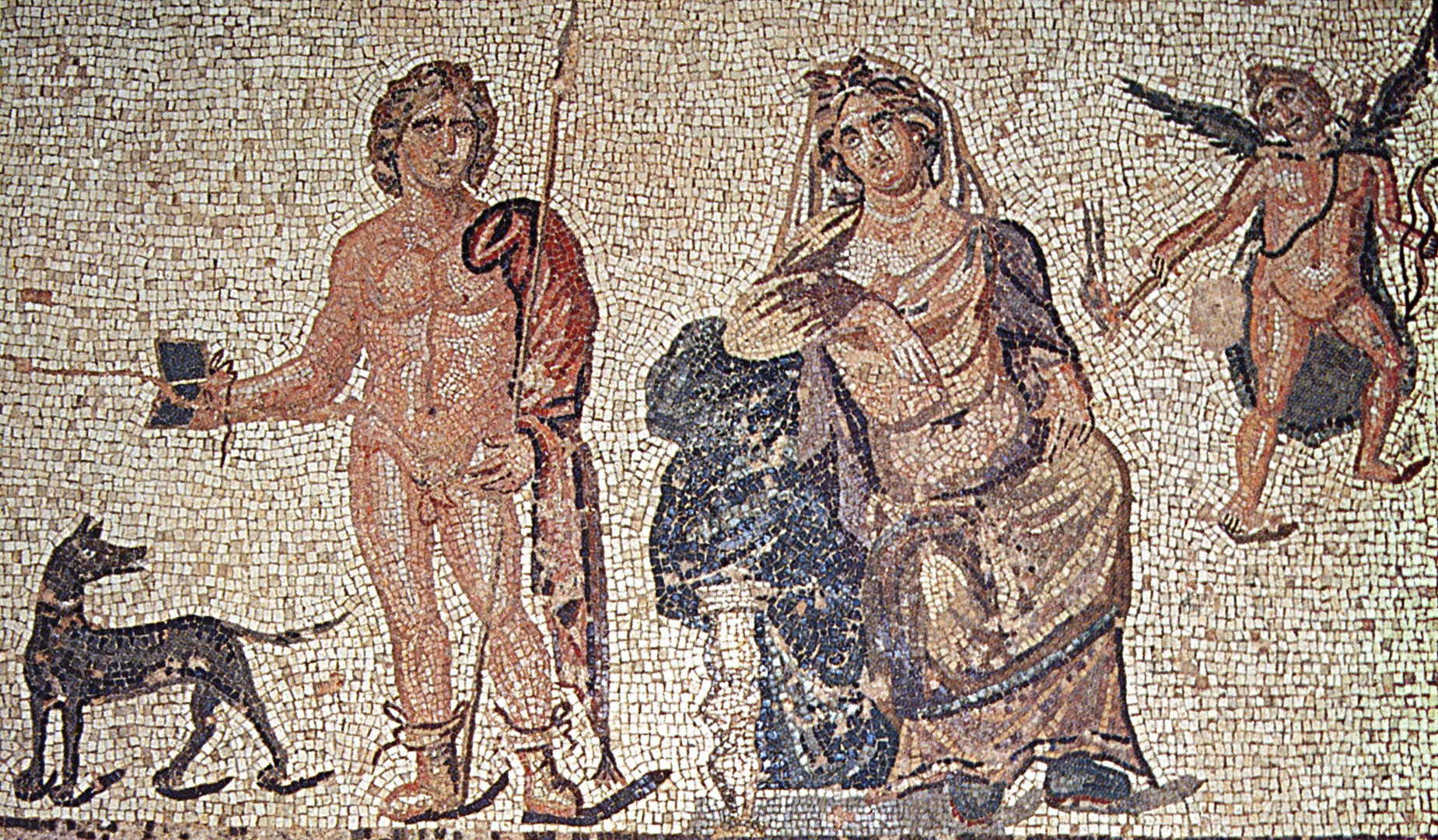 Εδώ απεικονίζεται η τραγική ιστορία της Φαίδρας και του Ιππόλυτου, ένα από τα πιο δημοφιλή θέματα στη λογοτεχνία και την τέχνη της αρχαιότητας. Η Φαίδρα, δεύτερη σύζυγος του Θησέα και μητρυιά του Ιππόλυτου, ερωτεύτηκε παράφορα τον νεαρό. Μην μπορώντας να αντισταθεί στα αισθήματά της έστειλε γραπτό μήνυμα στον Ιππόλυτο στο οποίο εξομολογήθηκε τον απαγορευμένο έρωτα της. Όμως ο Ιππόλυτος απέκρουσε τις προτάσεις της και για να τον εκδικηθεί η Φαίδρα τον κατηγόρησε στον πατέρα του ότι αυτός της πρότεινε παράνομες ερωτικές σχέσεις. Ο Θησέας οργισμένος, παρακάλεσε τον Ποσειδώνα να τιμωρήσει τον Ιππόλυτο. Ένας μανιασμένος ταύρος, που έστειλε ο θεός ξάφνιασε τα άλογα που έσερναν το άρμα του Ιππόλυτου. Το άρμα ανατράπηκε και ο νέος σκοτώθηκε πέφτοντας στα βράχια. Μετά τον θάνατό του αποκαλύφθηκε η αλήθεια και η Φαίδρα αυτοκτόνησε από τύψεις. Στο ψηφιδωτό απεικονίζονται δύο παράλληλα επισόδεια: στα αριστερά ο Ιππόλυτος σε κυνηγετική εξόρμηση (κυνηγετικές μπτότες, σκύλος) που μόλις έχει διαβάσει το μήνυμα της Φαίδρας, ενώ στα δεξιά η Φαίδρα στο παλάτι της κάθεται στο θρόνο περιμένοντας την αντίδραση του Ιππόλυτου. Πίσω από τη Φαίδρα, πετά ο Έρωτας που κρατά τον πυρσό του έρωτα και τόξο.