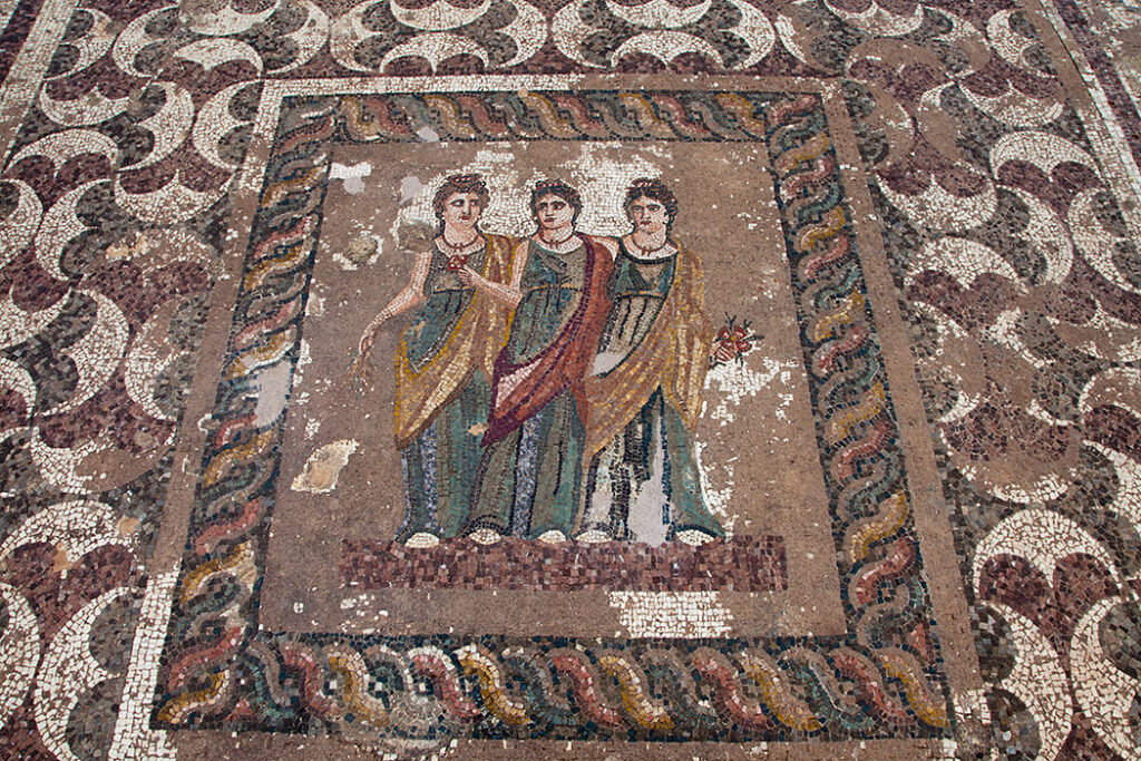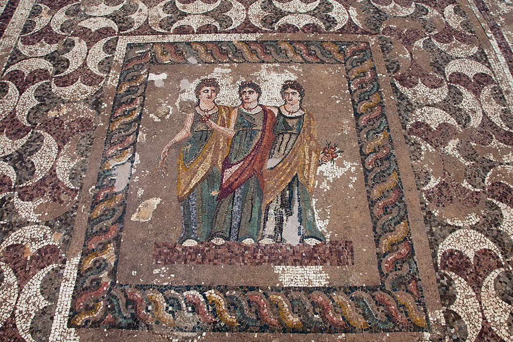 Ο κεντρικός πίνακας του δεύτερου ψηφιδωτού δαπέδου της «Ελληνιστικής Οικίας» απεικονίζει ένα σχετικά σπάνιο θέμα σε ψηφιδωτές συνθέσεις. Πρόκειται τις Τρεις Ώρες, οι οποίες σύμφωνα με τη μυθολογία ήταν κόρες του Δία και της Θέμιδας και αδελφές των Τριών Μοιρών και των Νυμφών. Είχαν διάφορες αρμοδιότητες μεταξύ των οποίων το άνοιγμα και το κλείσιμο των πυλών του Ολύμπου με σύννεφα, τη ρύθμιση των εποχών του χρόνου και τη βλάστηση της γης. Ήταν θεότητες καλόγνωμες, καλοπροαίρετες και ευεργετικές και προστάτευαν την ευημερία των ανθρώπων. Γι’αυτό στις τέχνες παρουσιάζονται σαν τρεις χαρούμενες, νεαρές κοπέλες, που χορεύουν κρατώντας το χέρι η μια της άλλης και έχοντας συχνά στο χέρι ένα λουλούδι ή ένα κλαρί. Στην παράσταση εδώ οι Ώρες, σε αντίθεση με τη συνηθισμένη χορευτική κίνησή τους, δεν απεικονίζονται να χορεύουν όπως στις άλλες περιπτώσεις αλλά στατικές και αγκαλιασμένες. Δεν παραλείφθηκαν όμως τα λουλούδια και κλαδάκια στο χέρι της κάθε μιας. Το ψηφιδωτό χρονολογείται στον 3ο αιώνα μ.Χ.