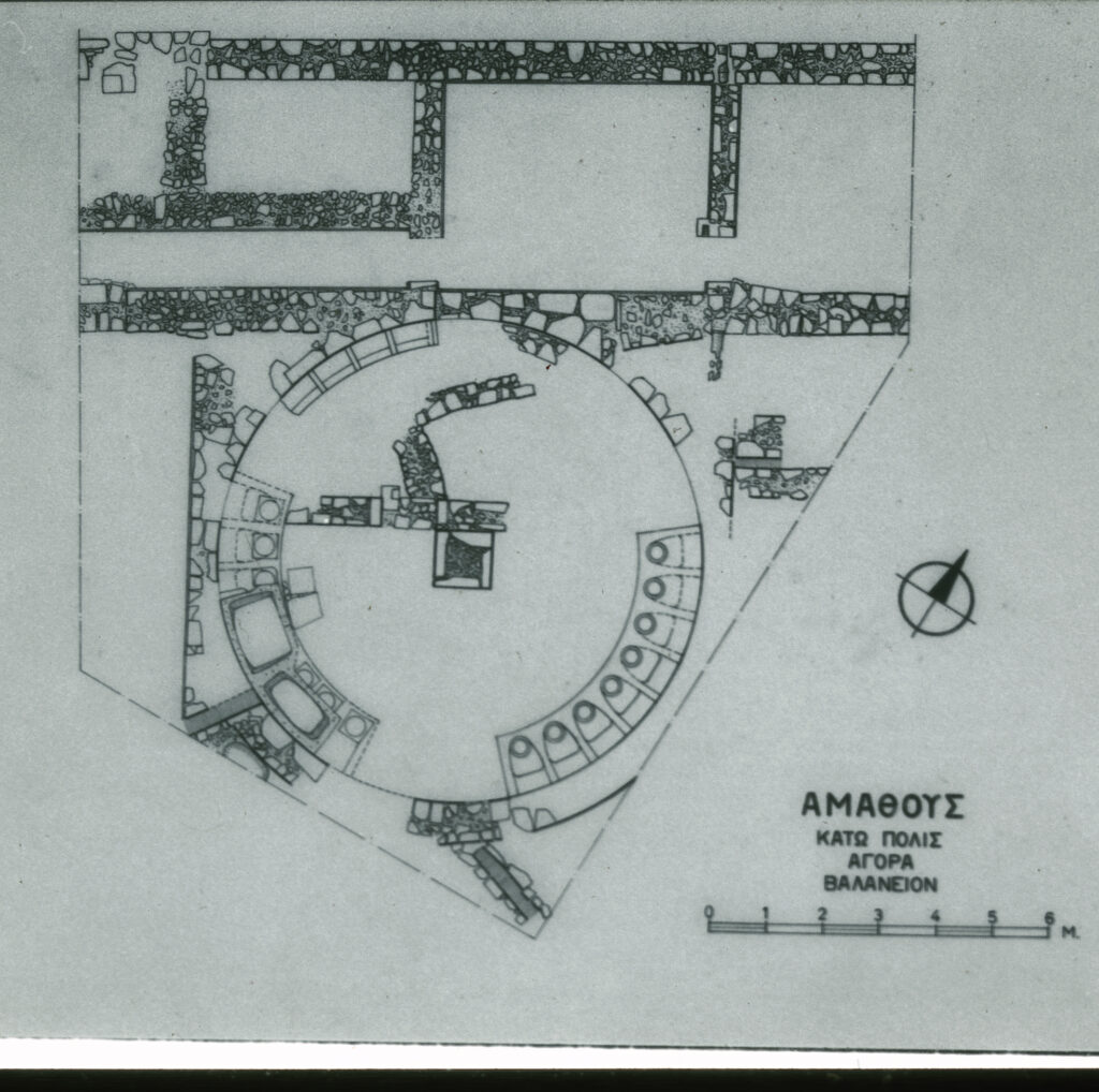 Το βαλανείο της Αμαθούντας χαρακτηρίζεται από την ύπαρξη βοηθητικών δωματίων που πλαισιώνουν κυκλικό δωμάτιο, στο οποίο πραγματοποιείτο το λούσιμο. Οι λουόμενοι κάθονταν περιμετρικά της κυκλικής αίθουσας όπου βρίσκονταν μικρές κυκλικές λεκάνες μέσα στις οποίες έπλεναν τα πόδια τους, ορατές σήμερα στο νοτιοανατολικό και νοτιοδυτικό τμήμα της αίθουσας. Μέχρι τον 2ο αιώνα π.Χ το λούσιμο γινόταν με κρύο νερό. Αργότερα προστέθηκε στο κέντρο της κυκλικής αίθουσας μια τετράπλευρη κατασκευή, η οποία πιθανότατα χρησίμευε για τη δημιουργία ξηρού ατμού. Επιπλέον, ο χώρος του λουτρού περιορίστηκε και προστέθηκαν λουτήρες για το λούσιμο του σώματος.