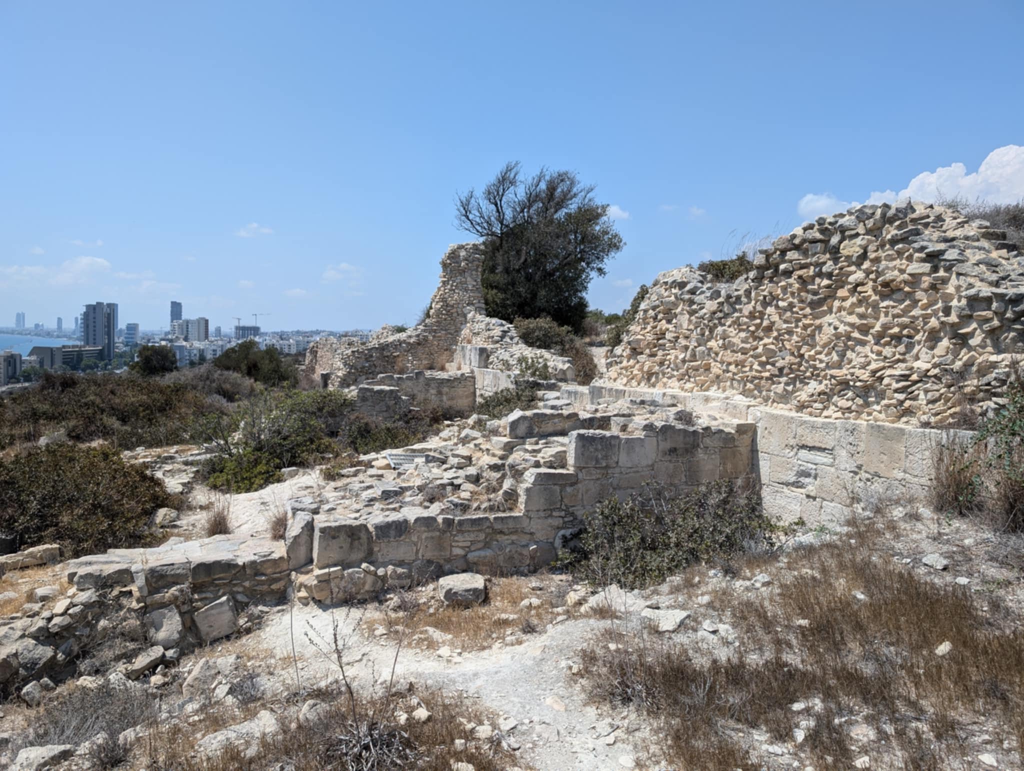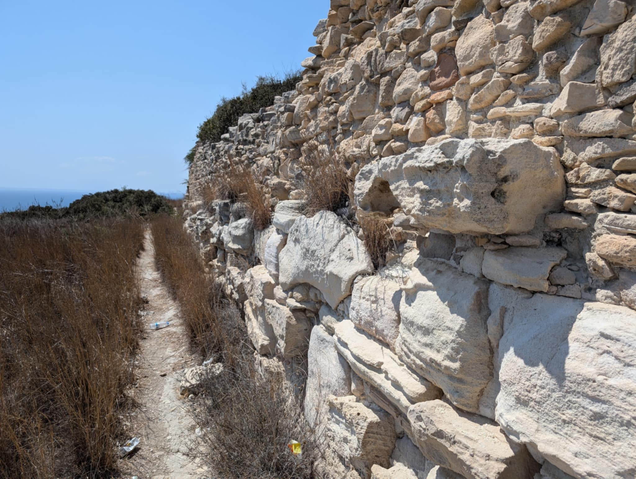 Στα νοτιοδυτικά κοντά στην θάλασσα σώζονται οχυρώσεις της Αρχαϊκής – Κλασικής περιόδου. Πρόκειται για ένα τείχος με δύο πύργους σε κάθε άκρο, οι οποίοι σήμερα σώζονται ερειπωμένοι. Το τείχος αυτό ενισχύεται την Ελληνιστική περίοδο. Αργότερα, τον 4ο αιώνα μ.Χ. σεισμοί πλήττουν το νησί και τα τείχη αυτά καταρρέουν αφήνοντας το κάτω μέρος της ακρόπολης απροστάτευτο μέχρι και τον 7ο αιώνα μ.Χ., όταν τα τείχη επιδιορθώνονται μια τελευταία φορά για την προστασία της πόλης από τις αραβικές επιδρομές.