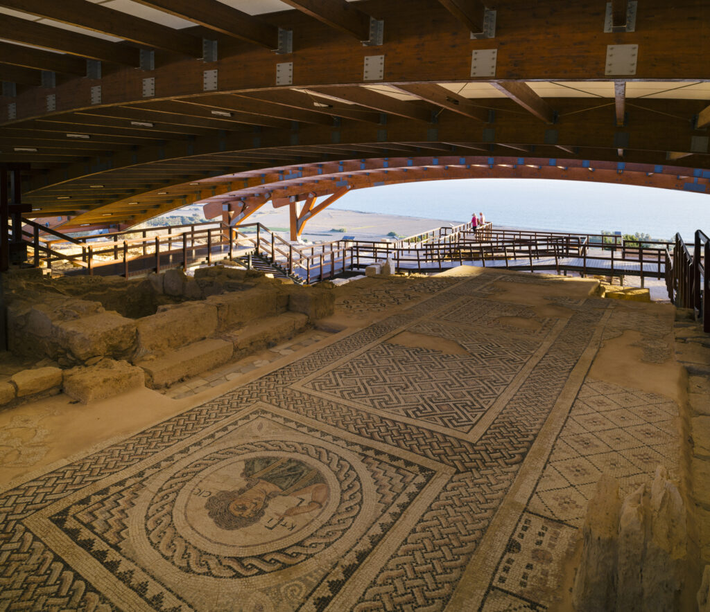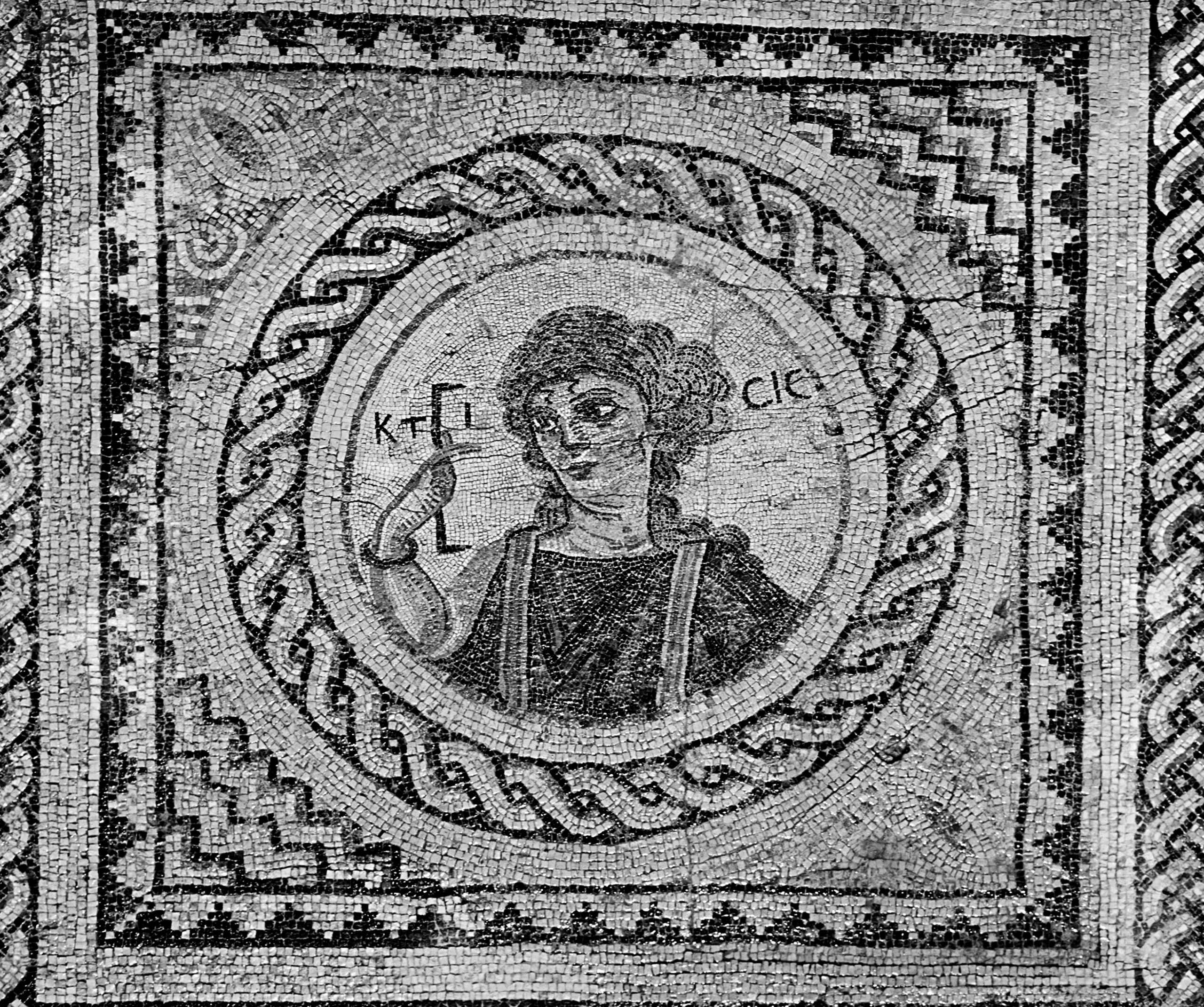 Ο μεγάλος ορθογώνιος κεντρικός χώρος των λουτρών, που αντιστοιχεί με το ψυχρό δωμάτιο (frigidarium), κοσμείται με περίτεχνο ψηφιδωτό δάπεδο. Το δάπεδο είναι χωρισμένο σε τέσσερις πίνακες, δύο από τους οποίους διακοσμούνται με καθαρά γεωμετρικά μοτίβα. Ένας πίνακας παρουσιάζει στο κέντρο μία πέρδικα, ενώ ο τέταρτος, στα βόρεια, αναπαριστά το μπούστο νεαρής γυναίκας σε μετάλλιο με πλοχμό, εγγεγραμμένο σε τετράγωνο πλαίσιο. Η γυναικεία μορφή, η οποία κρατάει ένα όργανο/ράβδο μέτρησης που αντιστοιχεί στον ρωμαϊκό πόδα, ονομάζεται σύμφωνα με την επιγραφή ΚΤΙΣΙΣ, είναι δηλαδή η προσωποποίηση της Κτίσεως/Δημιουργίας του Κόσμου ή της θεμελίωσης. Η προσωποποίηση της Κτίσης ήταν αρκετά δημοφιλές μοτίβο κατά την Ύστερη Αρχαιότητα και τα πρώιμα Βυζαντινά χρόνια.