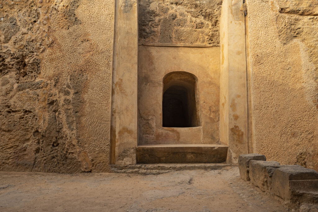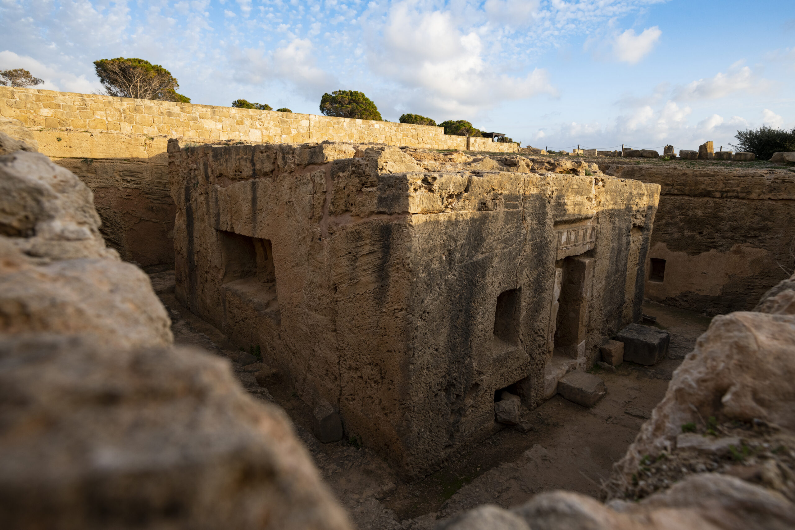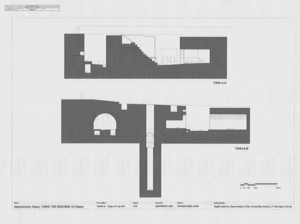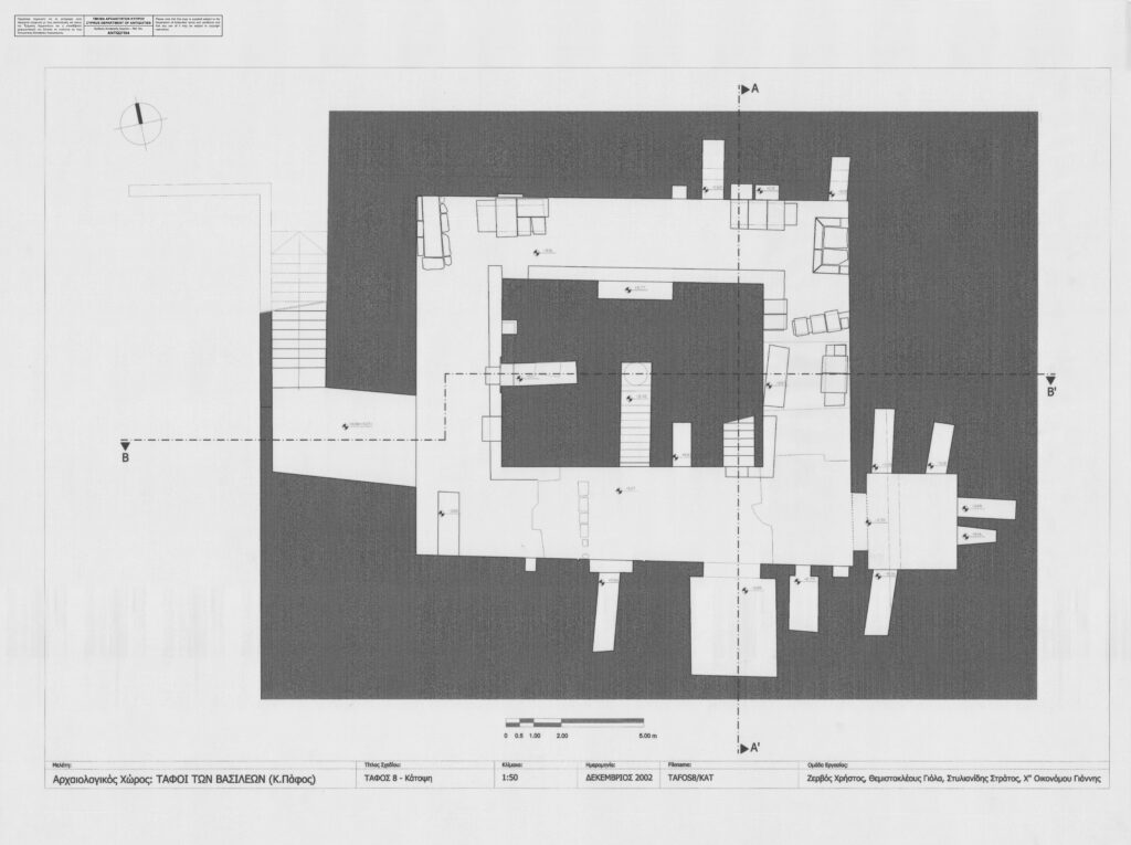 Το σημαντικότερο τμήμα του τάφου φαίνεται ότι ήταν αυτός ο κεντρικός λαξευτός βράχος, ο οποίος φιλοξενούσε μία ξεχωριστή ταφική θήκη, που εντοπίστηκε συλημένη. Η ναόσχημη πρόσοψη του τάφου ήταν περίτεχνα διακοσμημένη, μιμούμενη αντίστοιχες προσόψεις Μακεδονικών και Αλεξανδρινών τάφων. Οι πτέρυγες που περιβάλλουν τον κεντρικό τάφο βρέθηκαν γεμάτες με αρχιτεκτονικά μέλη (βρίσκονται κάτω από το στέγαστρο), ανάμεσα στα οποία δύο λίθινα γεράκια (εκτίθενται στο Αρχαιολογικό Μουσείο Πάφου), που αποτελούν σύμβολο εξουσίας των Πτολεμαίων Η ιδιαίτερη αρχιτεκτονική του τάφου, σε συνδυασμό με την πολυτελή διακόσμηση αλλά και η ανεύρεση των γερακιών, οδήγησαν τον ανασκαφέα του χώρου να εισηγηθεί τη χρήση του μνημείου για την ταφή μέλους της δυναστείας των Πτολεμαίων, ίσως του τελευταίου βασιλέα της Κύπρου. Η εισήγηση μερικών μελετητών για την ύπαρξη Δωρικού ναού ή Μαυσωλείου πάνω στον κεντρικό βράχο απορρίπτεται από τα αρχαιολογικά ευρήματα.