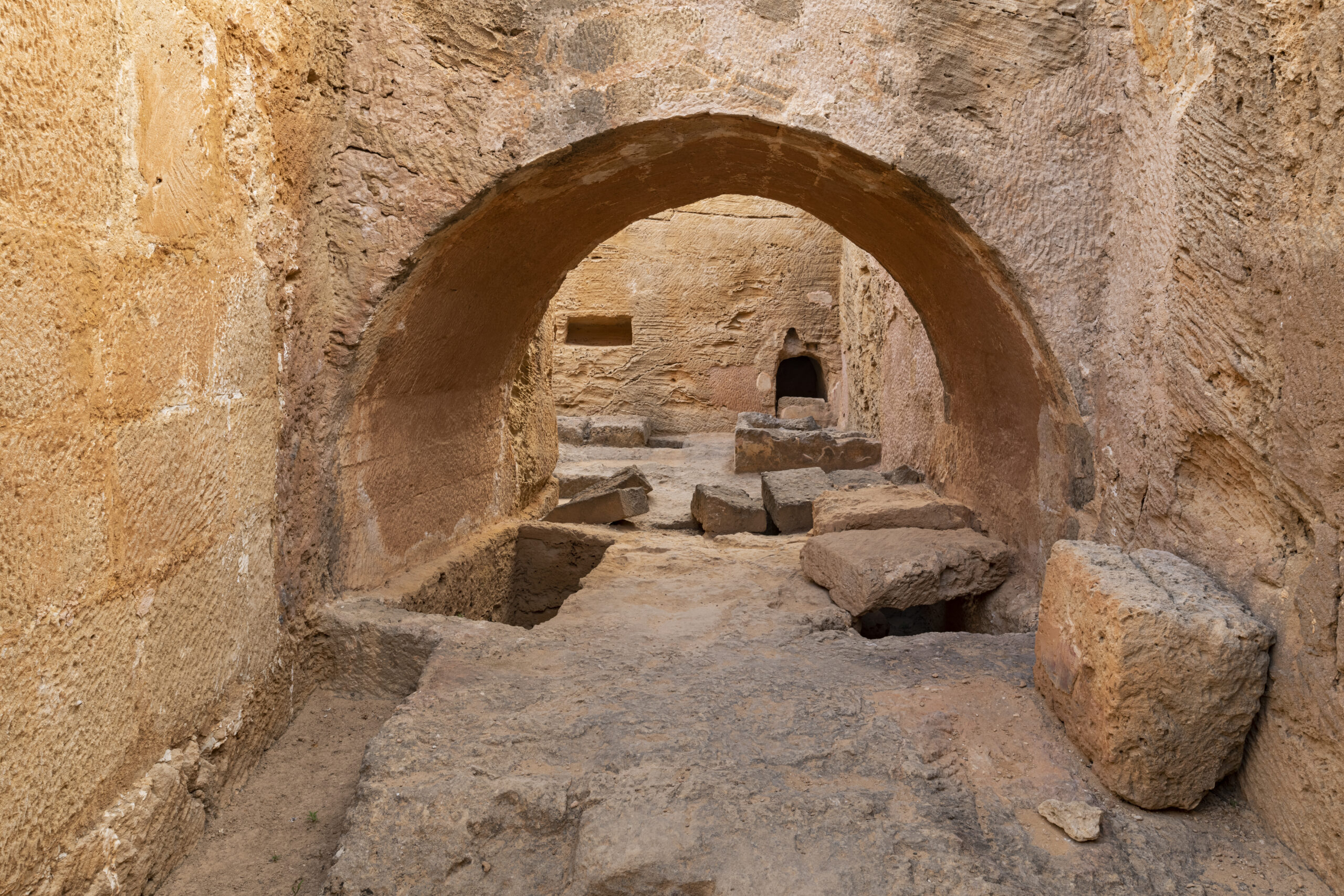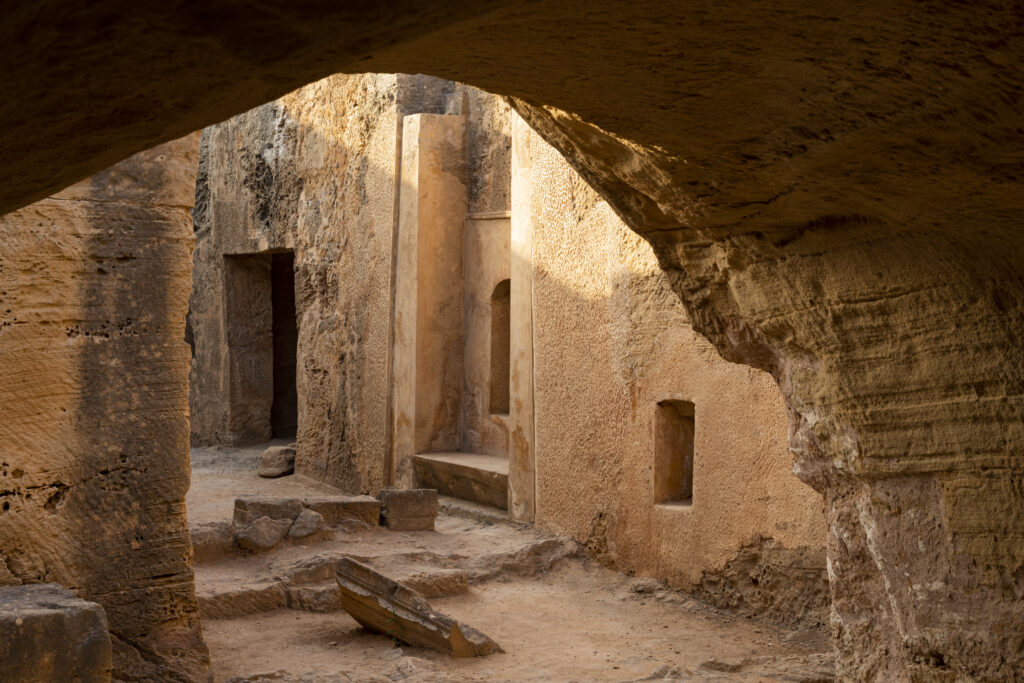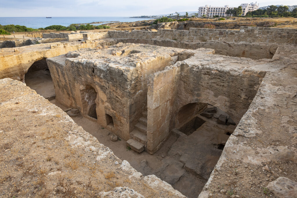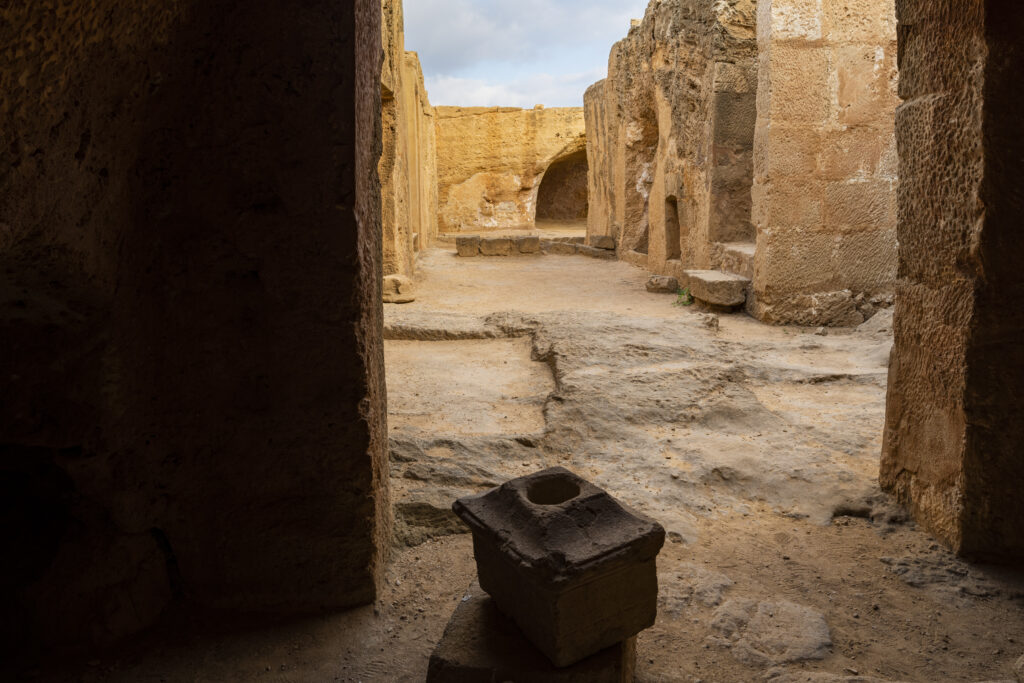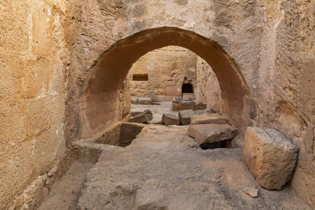 Εντός των διαδρόμων που περιβάλλουν τον κεντρικό βράχο ανασκάφηκαν αρκετές ταφές που χρονολογούνται στην ελληνιστική και ρωμαϊκή εποχή. Ενδεικτικά αναφέρονται τρεις που εντοπίστηκαν ασύλητες στη βόρεια και δυτική πτέρυγα. Ανάμεσα στα κτερίσματα που συνόδευαν τους νεκρούς ήταν ροδιακοί αμφορείς, μυροδοχεία και χρυσά φύλλα μυρτιάς. Μέσα σε μία άλλη παιδική ταφή εντοπίστηκε επίσης ένα μυροδοχείο τυλιγμένο σε λινό ύφασμα.