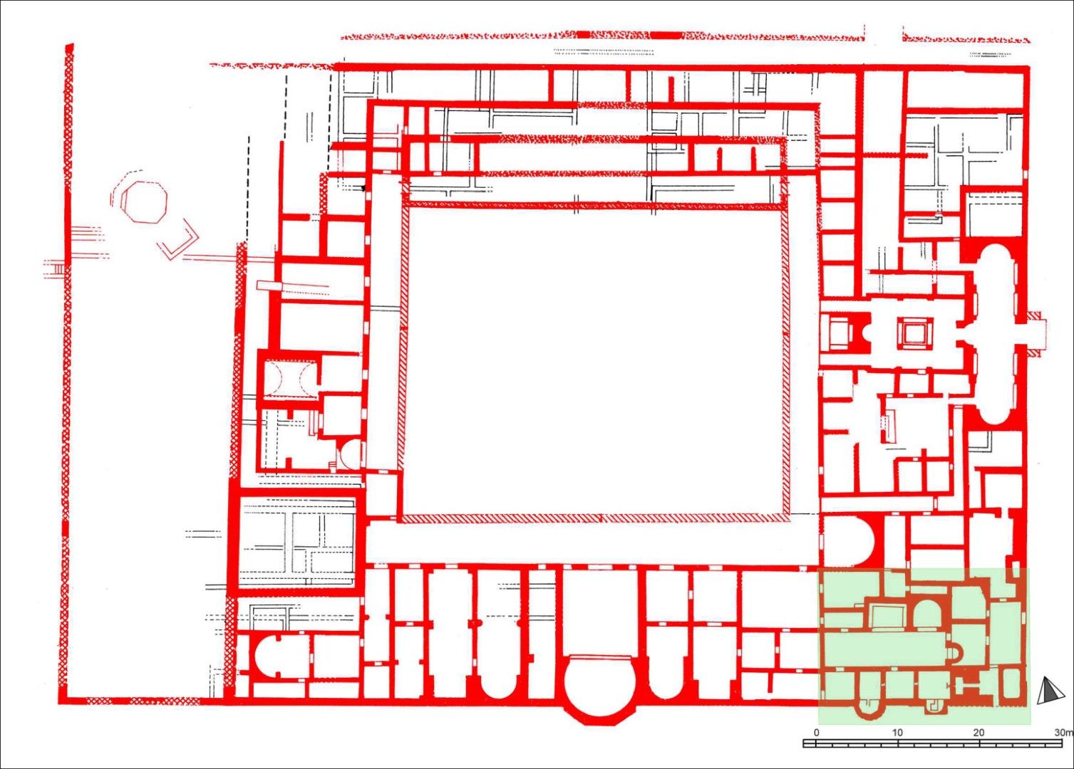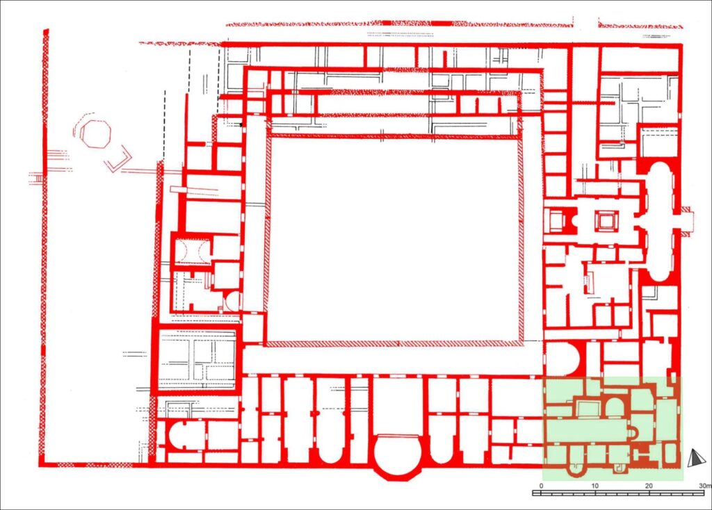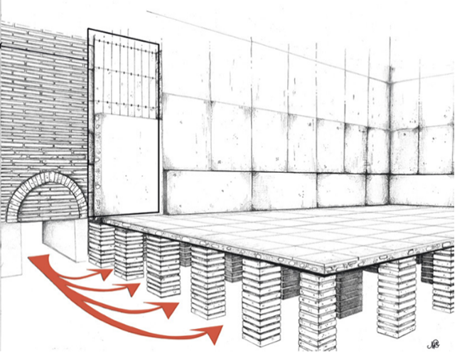 The bath complex of the "Villa of Theseus" is the largest ever found in a private residence in Cyprus and is estimated to have been able to accommodate up to 30 people at the same time. Due to its size and location, with an entrance from the road to the east, it seems that, in addition to private use, it may have also had a public function at one point. Upon entering the complex from the east, the bathers would first enter the changing room, where they would undress before proceeding to the cold room (frigidarium), a large, elongated hall at the centre of the complex, decorated with a geometric mosaic floor and equipped with a small basin for foot baths and two larger basins for cold bathing. The bather would then continue to the three heated rooms on the southern side of the complex: the warm bath (tepidarium), the steam bath (sudatorium), and the hot bath (caldarium). These rooms were heated using the hypocaust system. This involved a raised floor supported by small brick columns, beneath which hot gasses, released from a furnace to the east, would flow. The heat was then transferred to the walls via especially hollow tubes (tubuli).