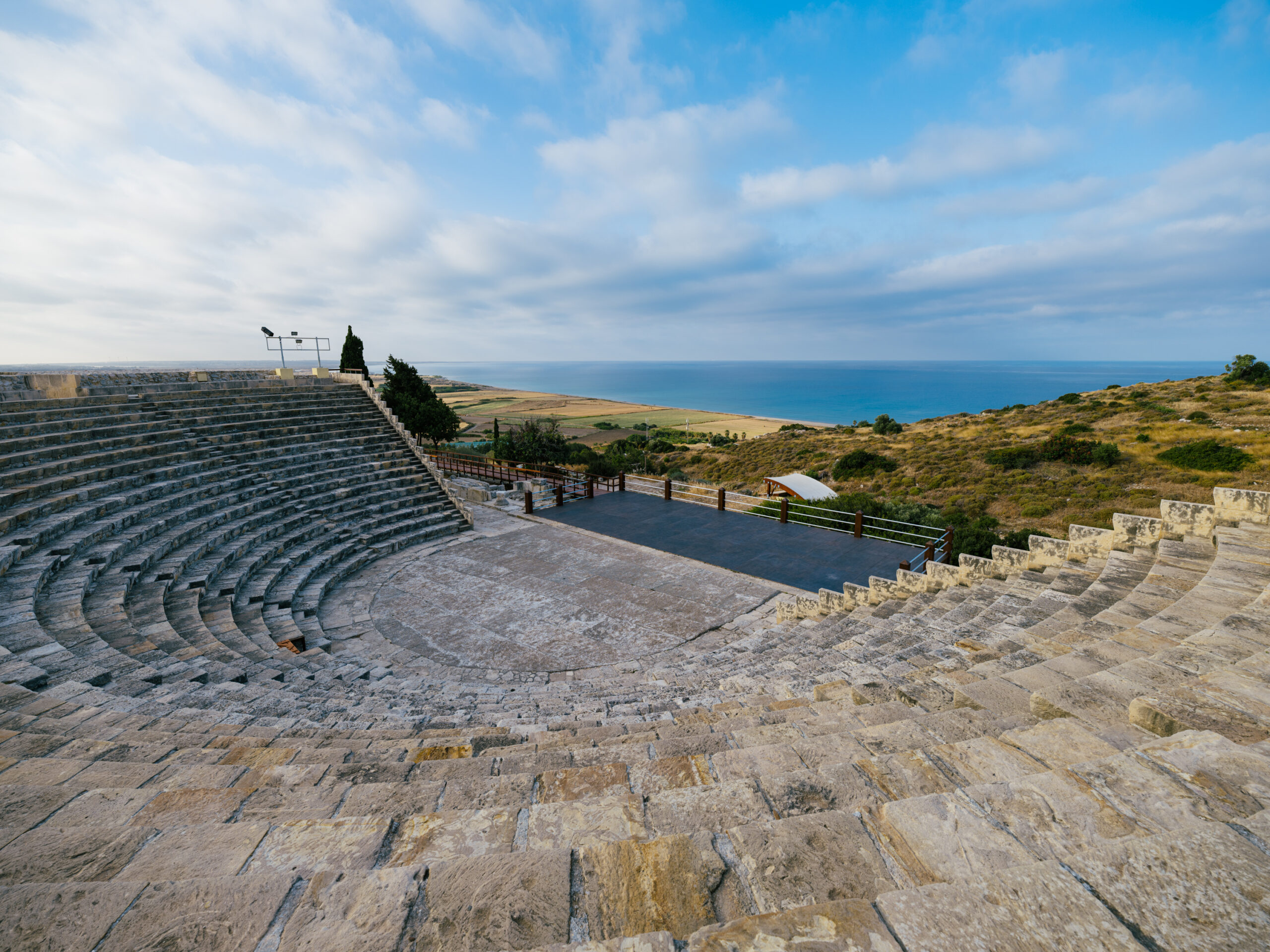The theatre of Kourion is located at the southern edge of the city’s hill, near the eastern entrance known as the Amathus Gate. The builders took advantage of the natural slope, with the central part of the koilon (cavea), the orchestra, and a large part of the stage underlying structures of the scene fronts carved into the natural rock. The construction of the building relied heavily on the region’s abundant limestone resources.