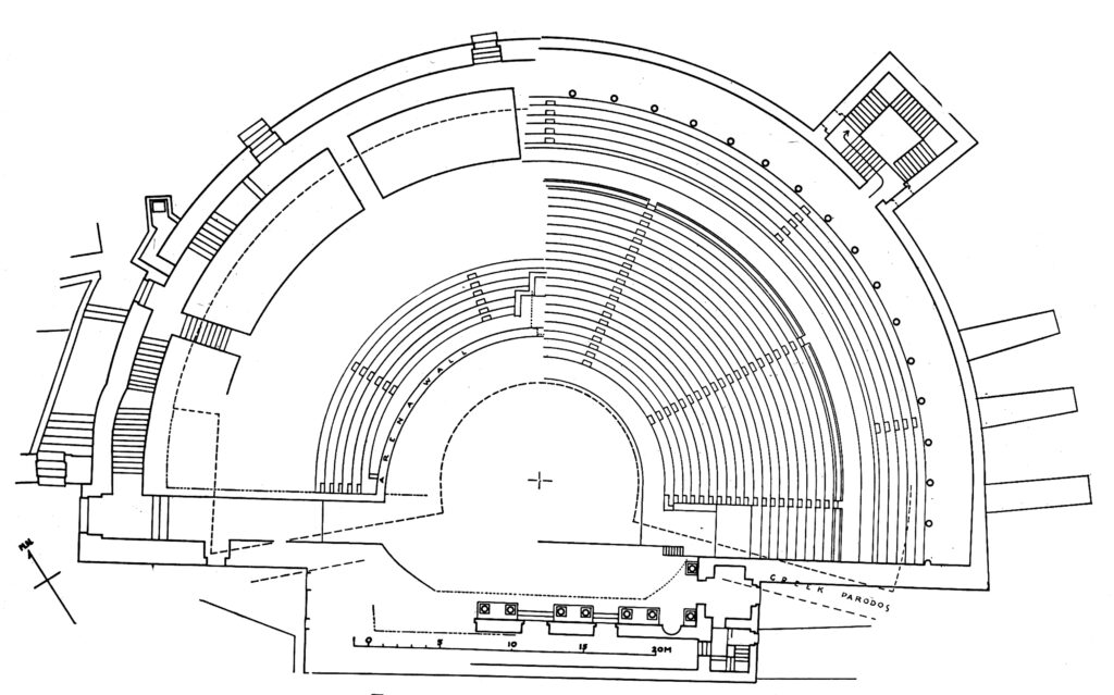 The theatre is semi-circular in plan, with a diameter of approximately 62 metres. Its koilon contained seating tiers and could accommodate around 3,500 spectators. Audience movement was facilitated by a vaulted corridor at the back of the koilon and by five stairways. Two additional entrances between the stage and orchestra allowed access to the vaulted corridor. Above the final row of seats, a colonnade encircled the koilon at its highest point, forming a roofed arcade.