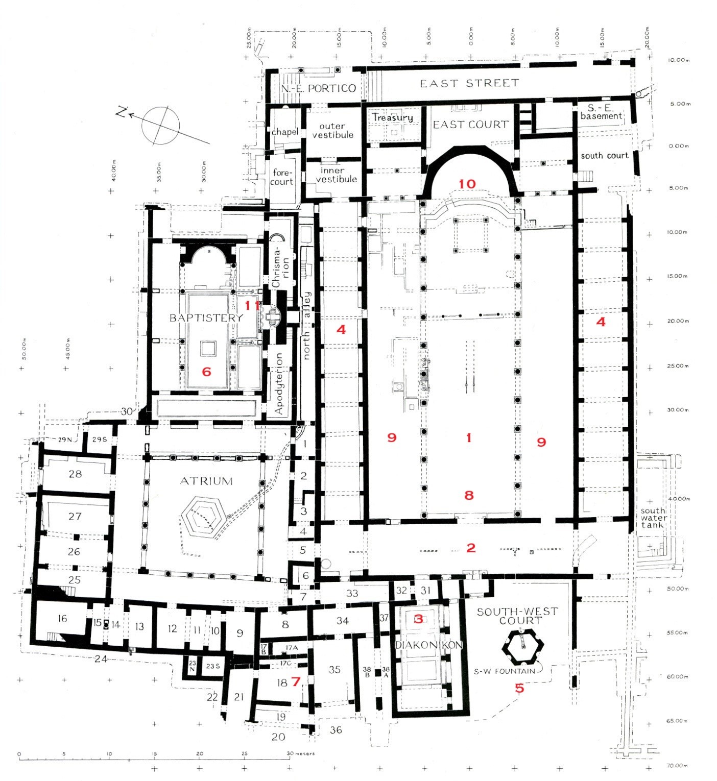 The three-aisled basilica measures 40 metres in length and 23 metres in width. Twelve granite columns on each side, with marble bases and Corinthian capitals, separated the central nave (8) from the two aisles (9). The apse is located at the eastern end of the central nave (10). The basilica was covered by a wooden pitched roof. The floor was decorated with mosaics, while the elevated area of the Holy Bema featured marble opus sectile (decorative geometric patterns made by multi-coloured marble pieces). The walls were covered with marble plaques bearing low relief decoration. The apse of the Holy Bema was likely decorated with wall mosaics.